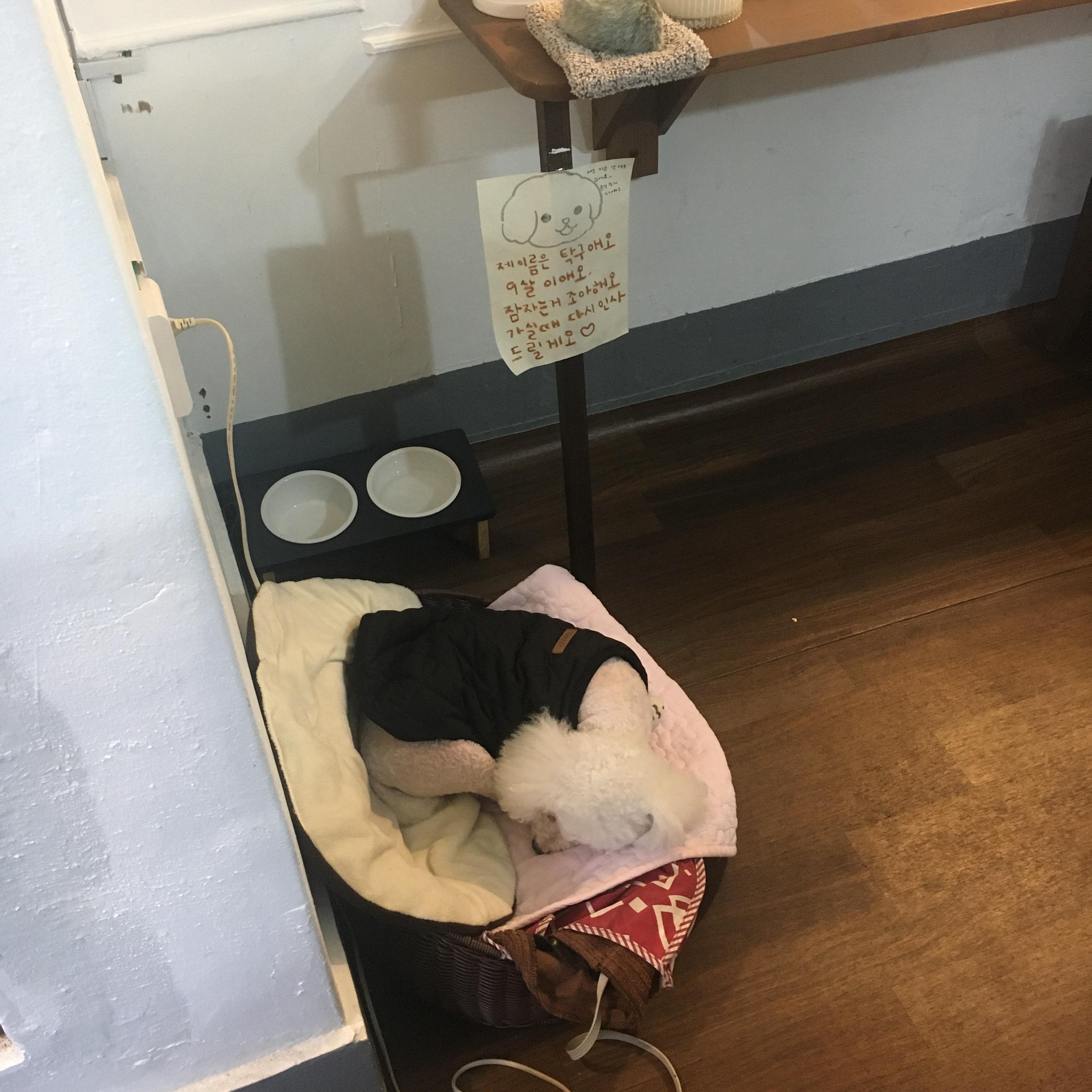 가게에 귀여운 강아지 탁구가 있어요